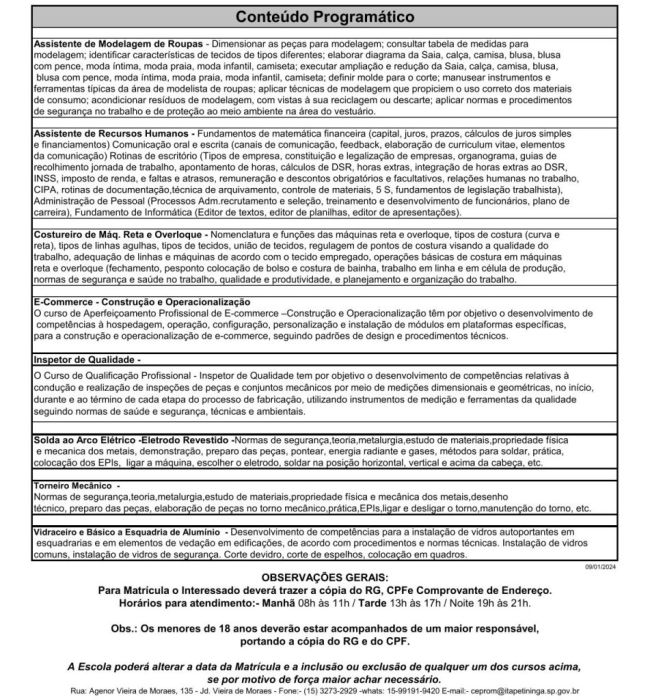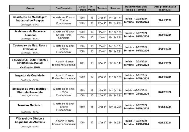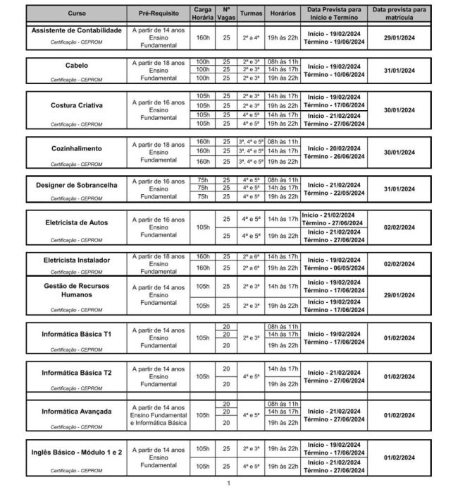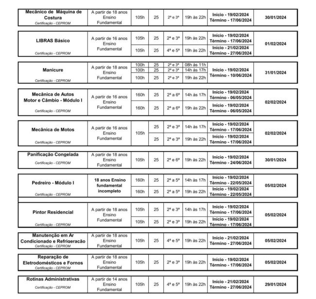 Confira abaixo as datas para matrícula, número de vagas e as informações sobre os cursos disponíveis: