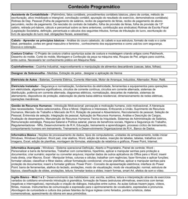 Detalhes sobre os cursos, datas para matrícula e número de vagas podem ser obtidos no folheto abaixo disponível em PDF para download