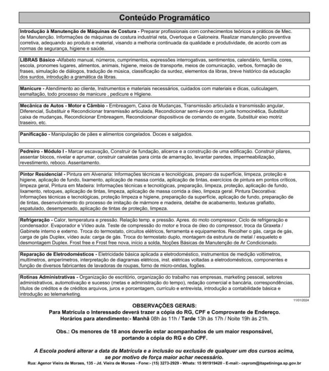 Os interessados devem comparecer ao Ceprom, à rua Agenor Vieira de Moraes, 135 – Jardim Vieira de Moraes, das 8 às 21 horas, de acordo com a data de matrícula do curso escolhido, com cópias dos documentos pessoais e comprovante de endereço. Menores de 18 anos deverão estar acompanhados de um maior responsável.