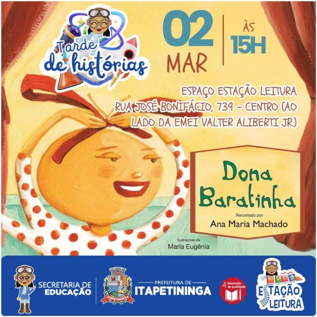 A Prefeitura de Itapetininga, por meio da Secretaria de Educação e Departamento Técnico Pedagógico, vai realizar neste sábado, dia 02 de março, a 1ª Tarde de Histórias de 2024.
