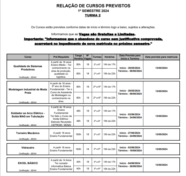 Confira abaixo as datas para matrícula, número de vagas e as informações sobre os cursos disponíveis: