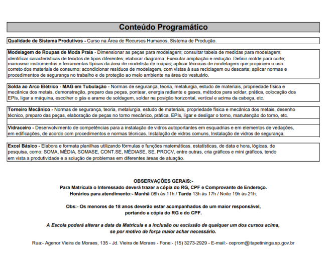 Para mais informações, os interessados poderão também entrar em contato no Ceprom no telefone (15) 3273-2929, ou ainda, no e-mail: ceprom@itapetininga.sp.gov.br