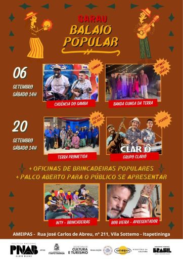 O Sarau Balaio Popular promete movimentar Itapetininga com muita música, diversidade cultural e integração comunitária. O evento acontece no espaço do AMEIPAS (Rua José Carlos Abreu, 211 – Vila Sotemo), com entrada gratuita e programação para toda a família.