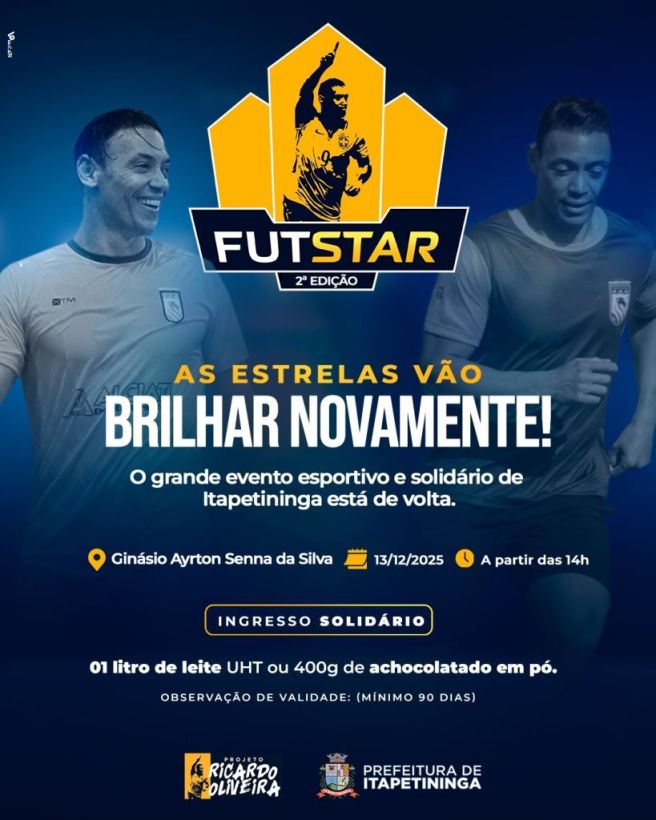 A 2ª edição do FUTSTAR já tem data marcada e promete, mais uma vez, unir esporte, solidariedade e grandes nomes em uma tarde especial para toda a família. O FUTSTAR é promovido em parceria público-privado entre a Prefeitura, através da Secretaria de Esporte, Lazer e Juventude, Secretaria de Assistência Social e o Projeto Ricardo Oliveira.